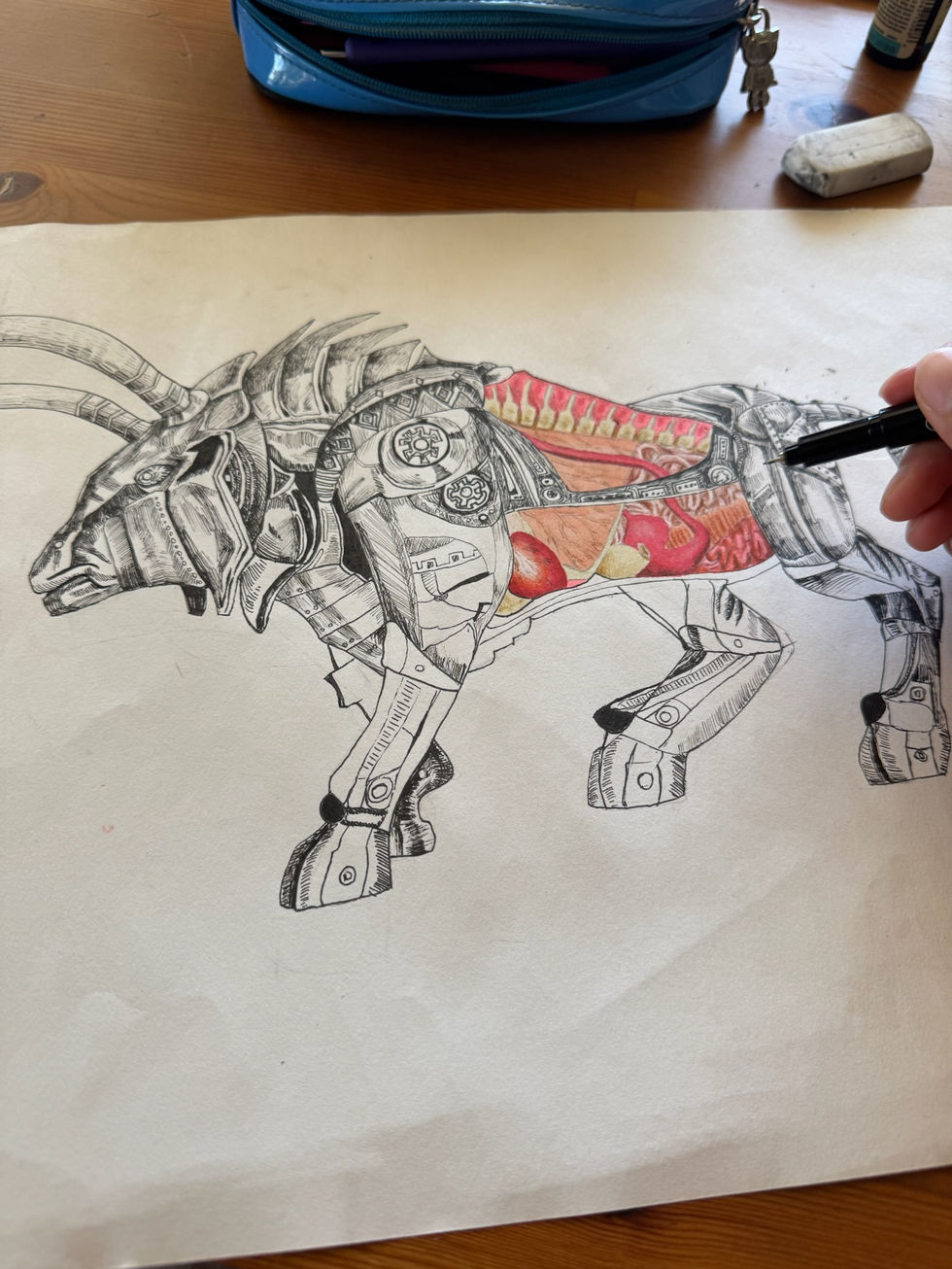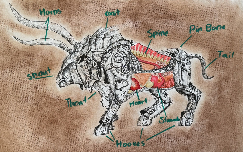 This work depicts a hybrid bovine figure combining mechanical components with anatomical structures. The labeled body parts reference scientific illustration, while the metallic exterior introduces engineered precision. By merging organic organs with mechanical frameworks, the piece examines how biological identity is increasingly defined by technological systems. The visual contrast between flesh and machinery situates the animal at the threshold between nature and fabrication, reflecting broader questions about adaptation, control, and the transformation of living beings in future environments.