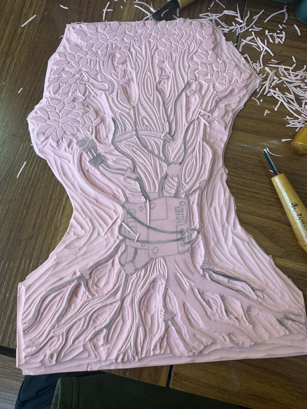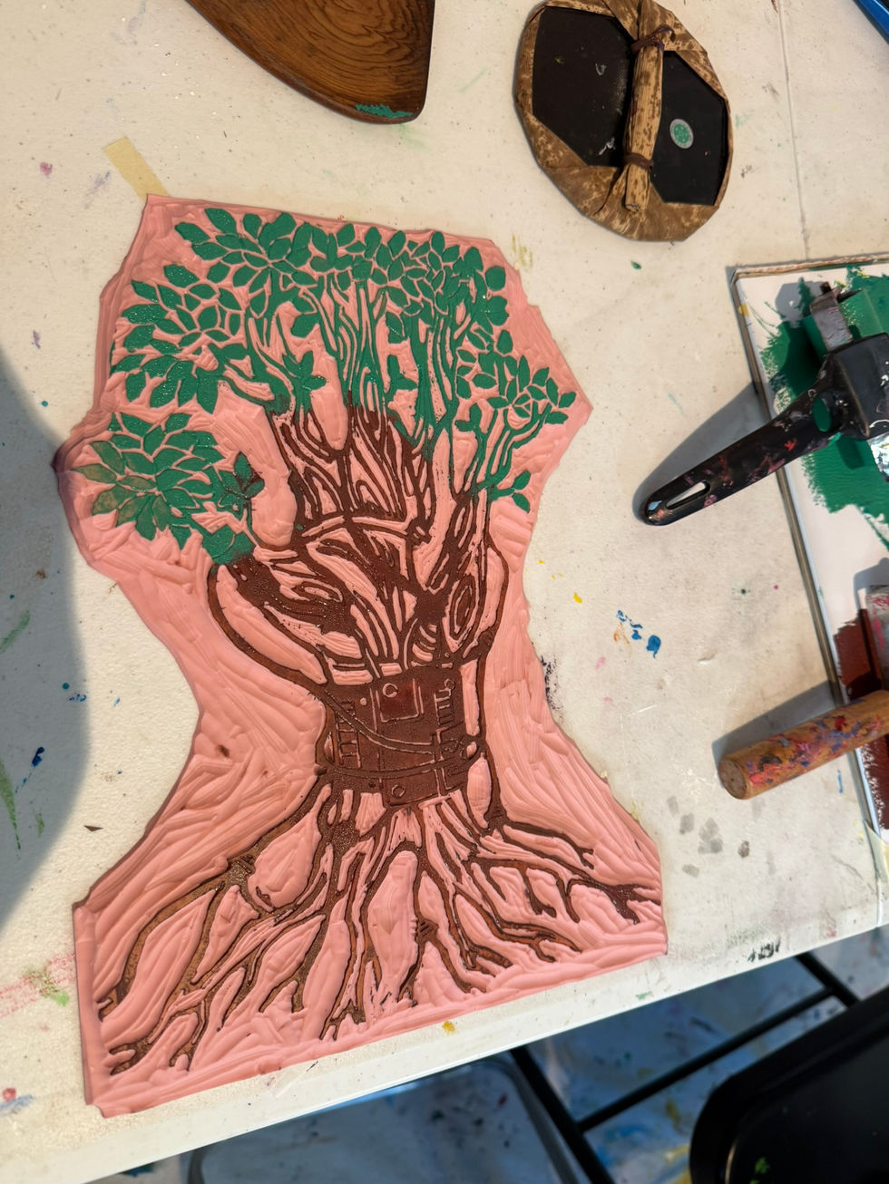 This print depicts a hand whose fingers extend into tree branches while its roots transform into electrical wires. The hybrid form merges human anatomy with ecological and technological systems, suggesting that identity is shaped through our entanglement with both natural and engineered environments. The transition from organic growth to industrial infrastructure speaks to shifting conditions of survival and dependency. By blending biological and mechanical structures, the work situates the human body within broader networks of connection, power, and control.