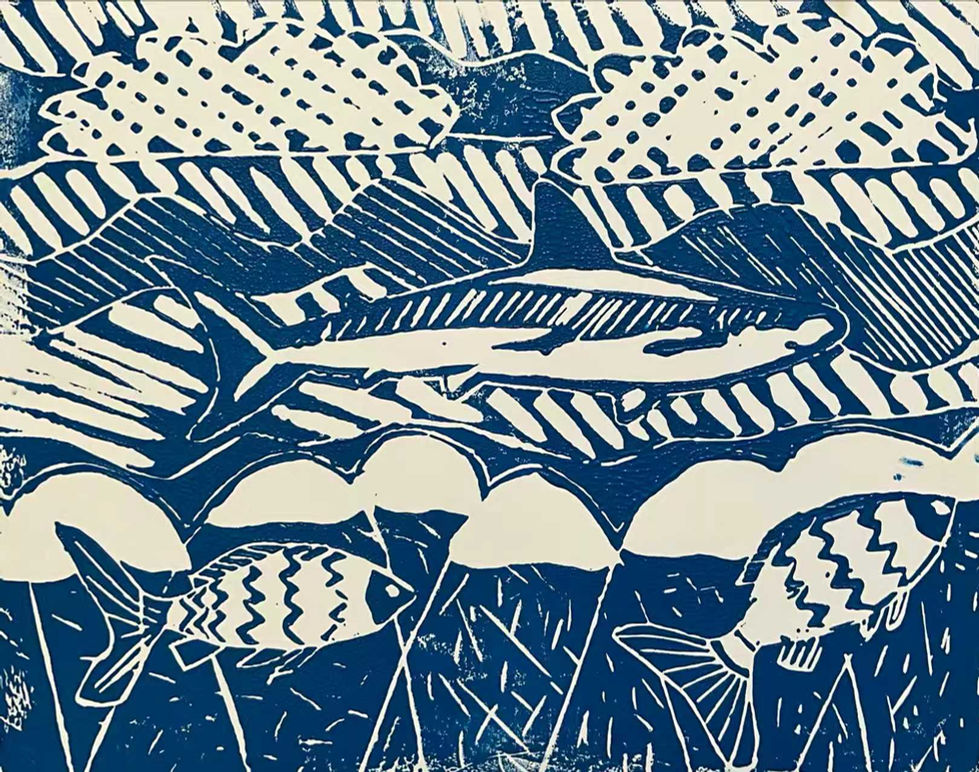 Swimming on the Sky is a printmaking work that reimagines a shark gliding not through the ocean, but across an atmospheric landscape of mountains, lakes, and clouds alongside other marine forms. Through the fusion of abstraction and geometry, and the layering of cool blues against crisp whites, the piece evokes both rhythm and disorientation, dissolving the boundaries between sky and sea, reality and imagination.